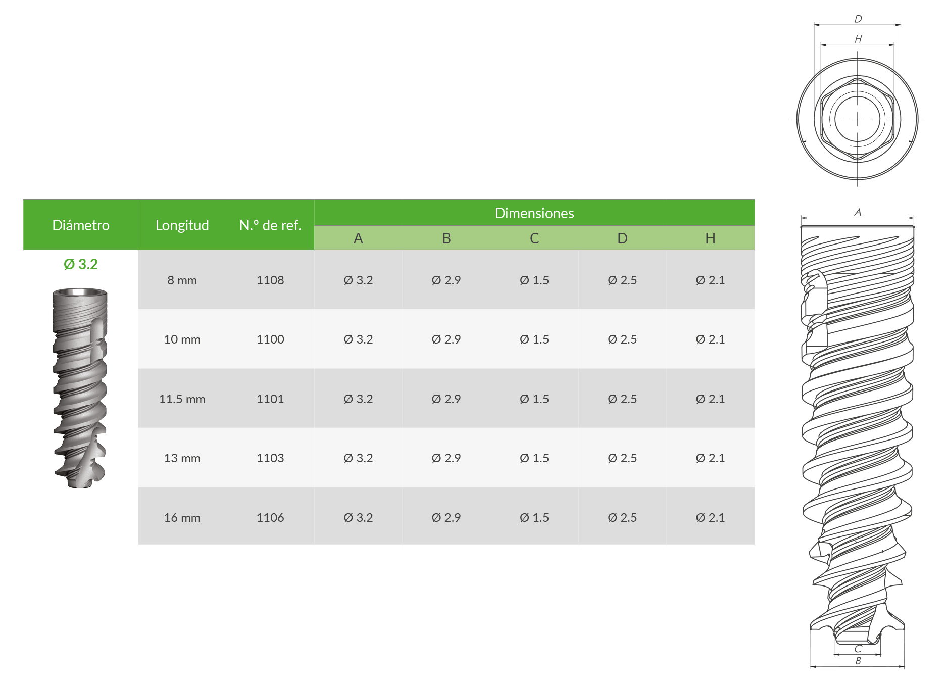 ● Parte apical cónica estrecha, con espiras afiladas y profundas. ●Características de centrado, anclaje y diseño variable de espiras. • Espiras dobles con paso de rosca de 2,4mm