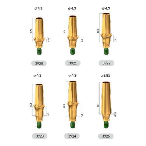 “Pilar estético recto para Conexión Cónica Estándar elaborado en titanio, disponibles en color dorado anodizado. Ofrece un resultado estético óptimo.